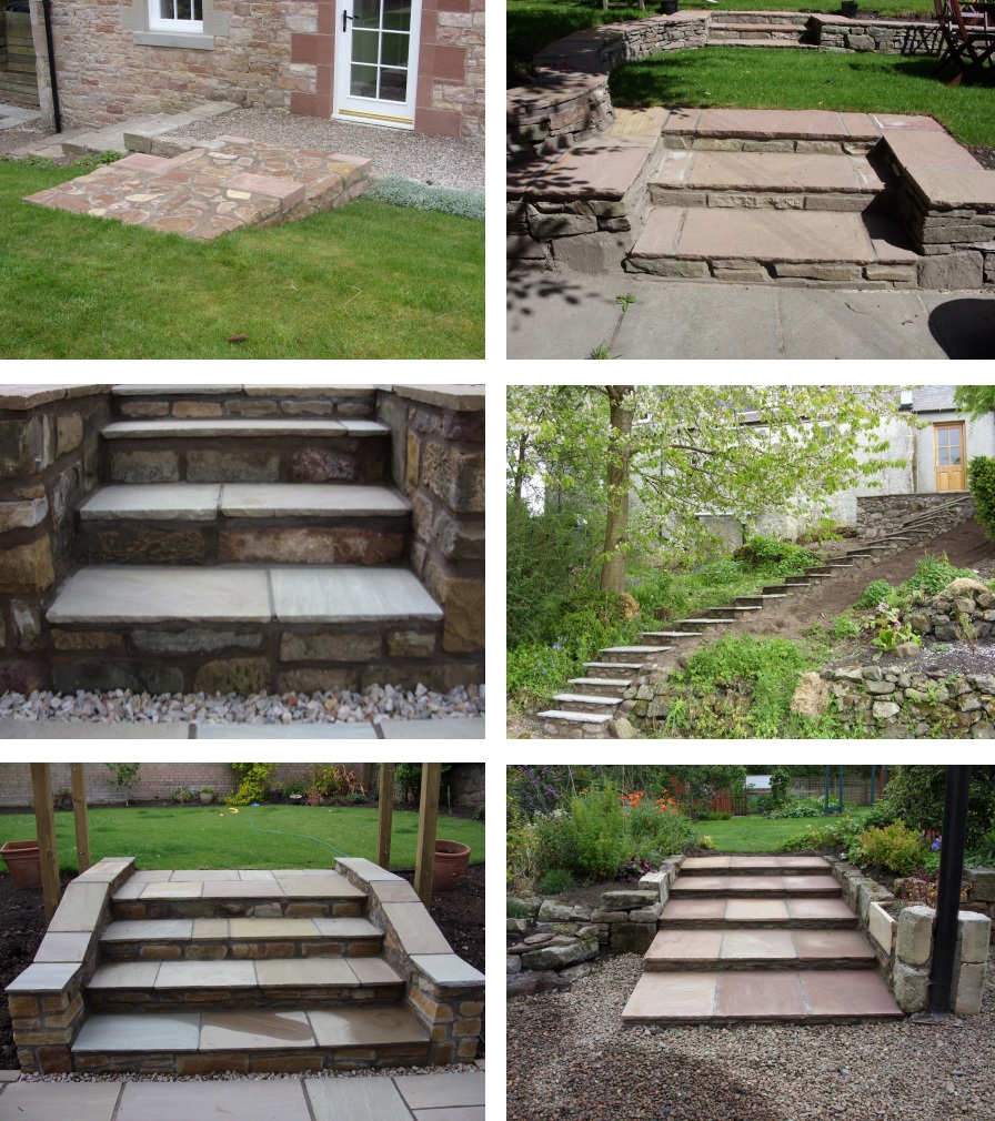 Steps are an ideal solution for terraced gardens and steep banks. They add structure to your space and a touch of class. Please look under the Woodwork Photos tab to view wooden options.